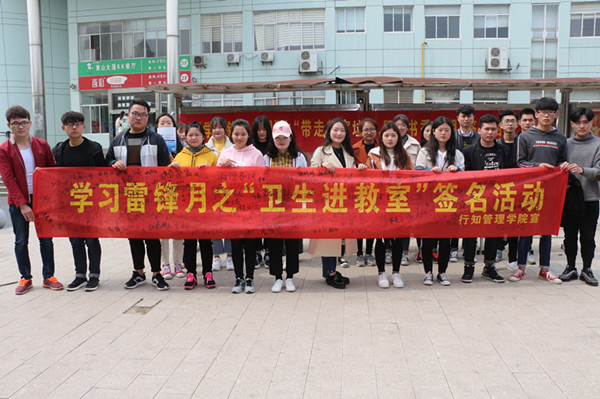 在“学习雷锋精神之文明进教室签字活动”中,同学们纷纷在横幅上签上自己的名字,并表示作为大学生要爱护教室,不乱扔垃圾,随手把教室里的垃圾带走,尊重保洁员的劳动成果,为建造文明校园而努力。