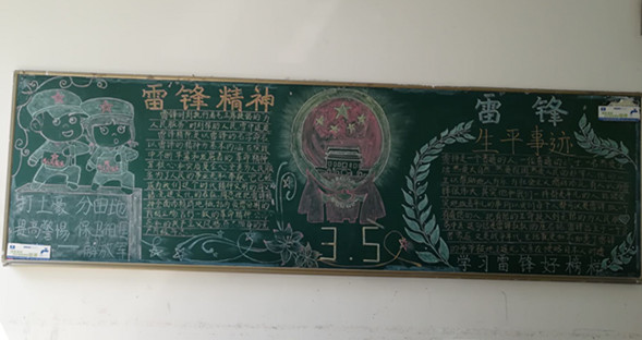 3月中旬,学院团总支组织大一班级同学们在本班固定教室出了一期以“学习雷锋精神”为主题的黑板报。同学们用彩笔在黑板上回望激情燃烧的雷锋岁月,满怀深情地抒发了对雷锋同志的缅怀之情,表达着继承雷锋精神的决心。