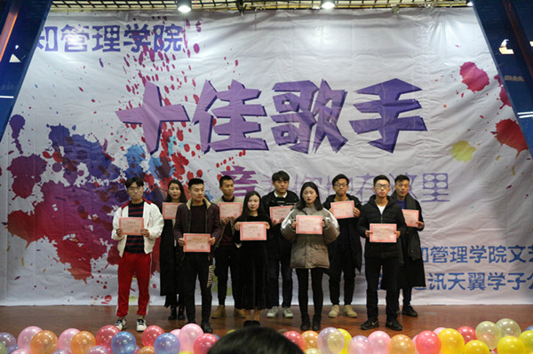最终,连锁1703班胡亚文、工商1701班彭鹏、工商1702班的翟志江、电商1403班高星月、经纪1701班关国辉、财务1602班梁羽、电子1702班汤明泽、物流1701班沈鑫、连锁1701班王静、高职1405班季晨宇等十位同学获得2017年度十佳歌手称号。其中胡亚文同学摘得桂冠,彭鹏和瞿志江获得二等奖,高星月、关国辉和梁羽获得三等奖,汤明泽、沈鑫、王静和季晨宇获得优秀奖。