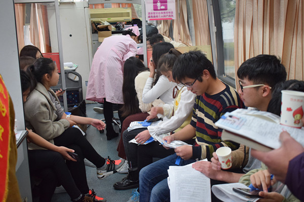 献血车开进校园的第一天,学生们就在车前排起了长长的队伍,并向现场的医护人员和工作人员介绍自己的身体情况,希望能够为这项公益事业贡献一点青春的力量。