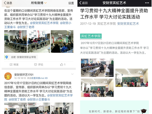 12月13日至20日,宾虹艺术学院以座谈会、口训、晚自习、学生宿舍、微博、微信为阵地开展了线上线下“学习贯彻党的十九大精神全面提升资助工作水平”大学习大讨论大实践活动。