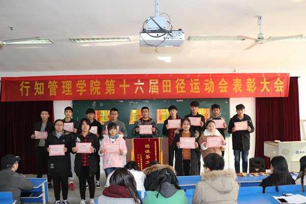 第十六届校园运动会中,行知管理学院获得男甲第二名、女甲第二名、男乙第三名、女乙第二名以及团体第二名的好成绩。会议宣读了优秀运动名单,老师们为优秀运动员和班级颁发了荣誉证书,为全体运动员颁发了奖牌和奖金。