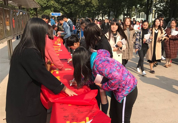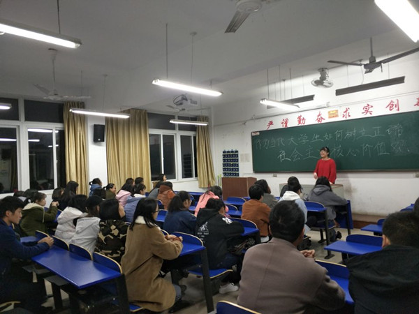 “学习宣传党的十九大精神”进班级。在践行社会主义核心价值观活动期间,大位会计学院各班级组织了主题为当代大学生如何体现社会主义核心价值观的时政表演,团总支副书记吴磊妹说:“此次活动让我们体会到,在当代中国,我们的民族、我们的国家应该坚守社会主义核心价值观。”接着安排了为期一周的主题为“学习宣传党的十九大精神”的口语训练,同学们观看了党的十九大的视频,进行交流学习,活动有力推进了党的十九大精神进班级。