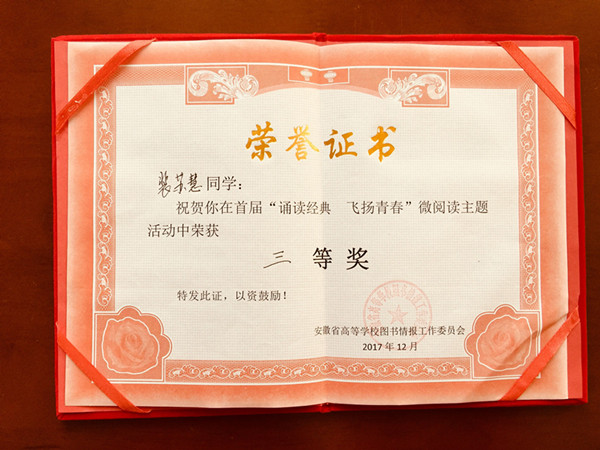 12月8日下午,由安徽省高等学校图书情报工作委员会主办、安徽省各高校图书馆协办、“e博在线”承办的首届“诵读经典,飞扬青春”微阅读主题活动颁奖典礼在安徽农业大学活动中心举办。历时两个多月、全省高校共计2000多份朗诵作品,由微信端线上传送作品,经由安徽人民广播电台和安徽省广播职业学院专家评审。最终,我校会计1711班裴苏慧同学凭借其良好的诵读表现和对诗歌情感的充分演绎,获得了三等奖。学校图书馆获最佳组织奖。