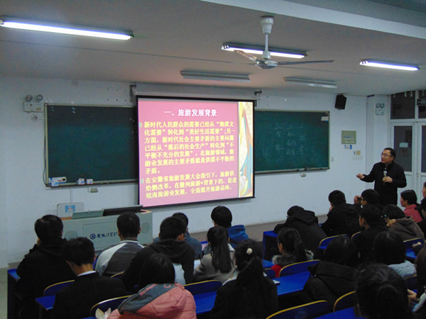 讲座从徽州的区域划分、由来及演变入手,从徽州厚重文化与徽州的历史人物,以及徽州旅游资源四个方面展开,向同学们介绍徽州历史名人、徽商、徽菜、黄山等丰富的人文和自然旅游资源,着重提到全域旅游,“旅游+”的概念,旅游+互联网,旅游+交通,旅游+教育,旅游+休闲度假,旅游+养老,旅游+养生,旅游+美丽乡村建设,旅游+创新创业,旅游+装备制造,即发挥旅游业带动作用,在创新、协调、绿色、开放、共享的新发展理念引领下,旅游要顺应人民对美好生活的向往,为努力打造加速崛起的经济强省、充满活力的文化强省、宜居宜业的生态强省做贡献,加快建设美好安徽。