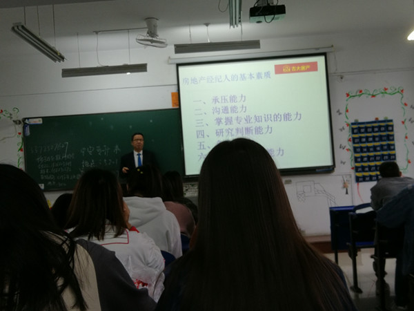 韩可德的讲座主题是“房地产经纪人基本素质和心态”,他先根据当前的行业态势和相关专业就业形势进行了解析,鼓励大家在校期间努力学习,严格要求自己,尤其要积极乐观,吃苦耐劳,并对房地产经纪人的六大能力和六大心态分别进行了详细说明,并结合丰富的实战经验讲述了生动的案例。课堂互动频繁,气氛活跃,掌声不断。