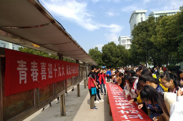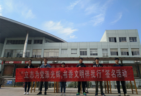 同学积极参与,纷纷在“立志为党添光辉,书香文明伴我行”的红色长条横幅上郑重签名,长长的横幅表达了同学们对知识的向往与追求。