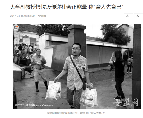 “一手拿着垃圾钳,一手提着垃圾袋,边走边捡被人随手抛弃的矿泉水瓶、烟头、纸屑……在合肥街头,你可能看到过这位戴着眼镜,穿着红马甲的中年男子。他叫许锬,今年40岁,安徽财贸职业学院朱熹文旅学院商务英语专业副教授。讲台上的他风采飞扬,出口成章,讲台下的他还是一名义工,常常参加一些公益活动,比如捡垃圾、看望贫困老人。”这是4月16日刊登在新安晚报上关于朱熹文旅学院一名党员教师的生活侧写,朱熹文旅学院党总支副书记宋凌云表示,像许锬老师这样的优秀共产党员,朱熹文旅学院还有很多。