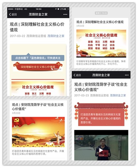 茂荫财金学院在此次“社会主义核心价值观宣传月”中积极组织,以“新媒体引导、多层次覆盖、高渗透践行”三大特点做好各项工作。多力齐发,力求在宣传月中找准大学生们思想的共鸣点、交汇点,做到贴近性、对象化、接地气。