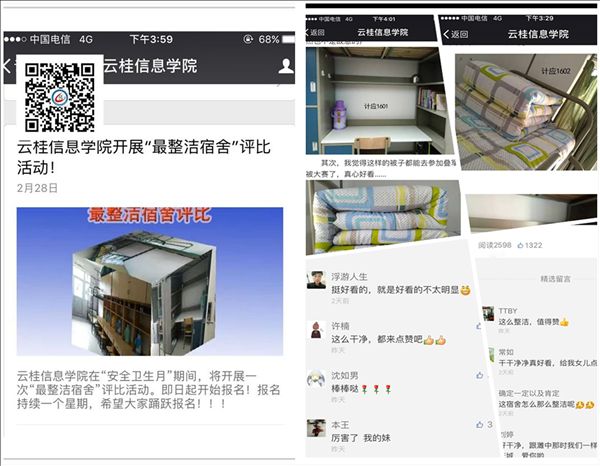 3月2日起,云桂信息学院微信公众号每日发布当日最整洁的宿舍并附照片和说明,每日转发率高达百次,每日最整洁宿舍点赞量高达千余次。微信公众号即将在4月1日至7日开展“最整洁宿舍”投票活动,为我院安全卫生月活动的宣传提供了学生宿舍的展示平台,提升了安全卫生月的宣传力度。