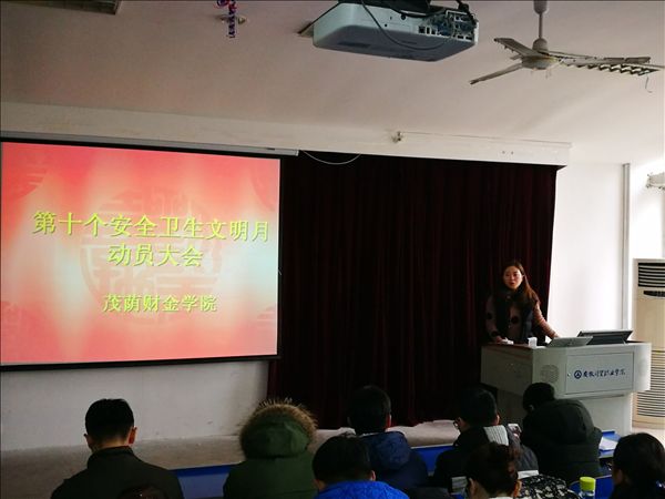 在筹划组织学院第十个安全卫生活动时,茂荫财金学院以党建为抓手,以入党积极分子、学生干部为突破口,狠抓学生文明养成教育。2月21日,茂荫财金学院召开第十个安全卫生月动员大会,党总支书记徐明,团总支书记、学生秘书梁惠婷及专职辅导员童杰、李林育出席了会议,全体入党积极分子、各班级主要学生干部及寝室长参加了会议。