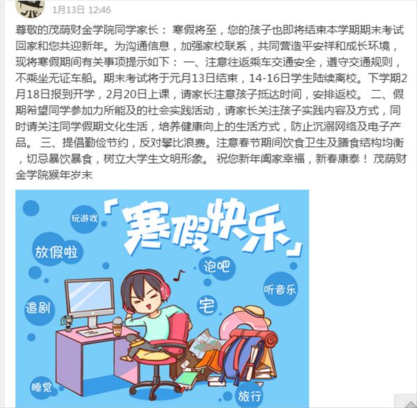 1月13日,本学期考试全部结束,财贸学子们将陆续返回家乡,回到父母身边,开启寒假模式。茂荫财金学院通过手机、QQ等信息化终端群发寒假温馨提示加强家校联系。