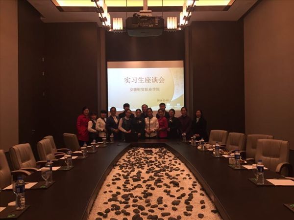 11月2日,万达文华酒店召开安徽财贸职业学院2014级酒店管理专业顶岗实习生座谈会,酒店人力资源部负责人,朱熹文旅学院院长刘葆、党总支副书记宋凌云、副院长钟晓鹏、旅游管理教研室主任钱晓慧老师出席座谈会。