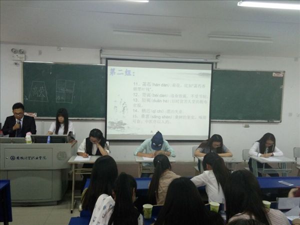 汉语知识听写大赛设置了两个环节,词语听写和成语听写,考察同学们对于中国汉字的了解、理解、运用的水平和能力。由于报名人数较多,旅游管理系安排了预选赛,同学们分小组,通过聆听词语、成语的语音及释义,完成词语和成语的书写。