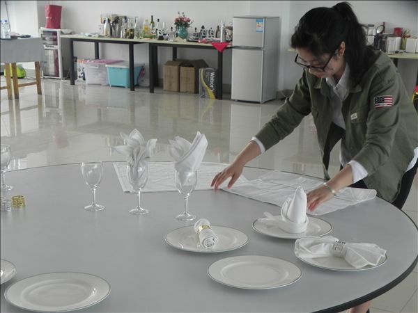 参赛选手通过初赛的闭卷答题后,成绩优秀的前十名选手进入决赛。决赛要求选手在规定时间内完成8种餐巾花型,并需要对花型进行简要的解说。决赛中,各位选手折花手法娴熟,拉、推、折、叠、捏、整等各种动作一气呵成。杯花、盘花各领风骚,整洁、雪白的餐巾在选手们的手中不断变换造型,展示出了餐巾平凡背后的魅力。
