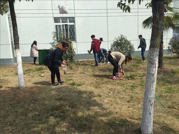 同一天,电子信息系生活部部长带领部门干事和2015级团支书将四号宿舍楼周边环境进行清理维护,同学们将塑料袋、废纸、烟盒等垃圾全部拾起,装进事先准备好的袋子里,通过两个小时的辛勤劳动,宿舍周边的环境得到了很大的改善。