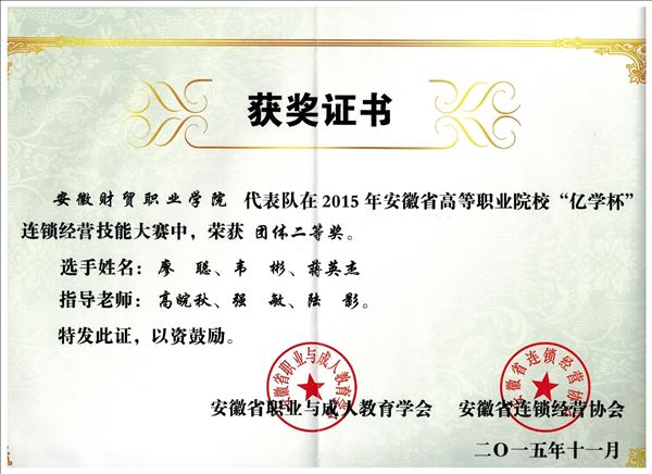 1月16日,安徽省连锁经营管理协会牵头举办的2015年安徽省连锁业年会在合肥黄山大厦召开,年会表彰了2015年“亿学杯”连锁经营技能大赛的获奖选手和单位,我院行知管理学院获二等奖。