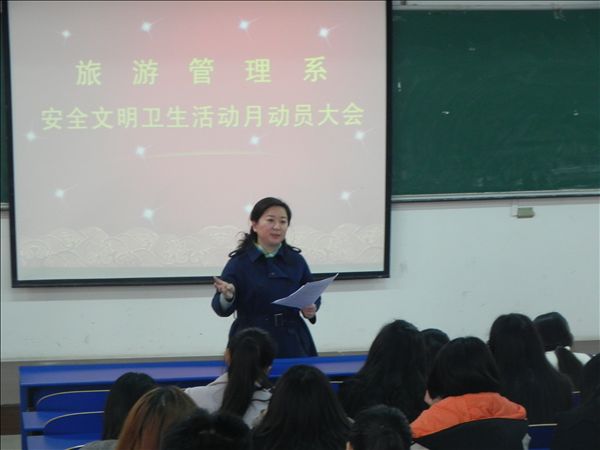 3月3日中午,旅游管理系在6101教室召开第九届安全文明卫生月动员会,强调“强化安全意识,提高自身修养”。系副主任宋凌云发表动员讲话,学生秘书汪双出席了会议。
