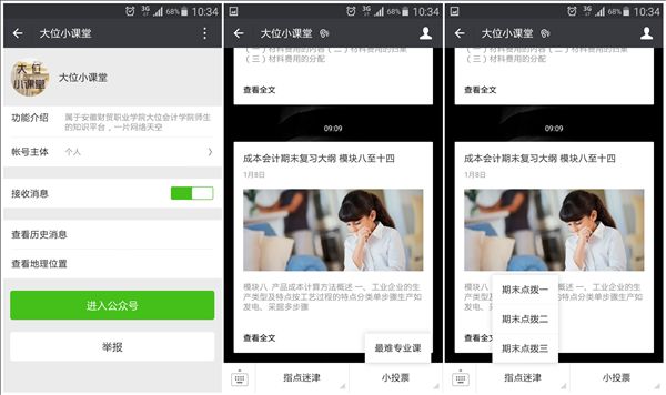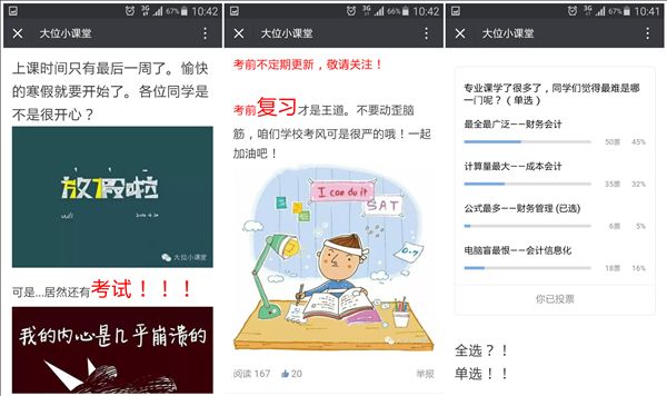 “大位小课堂”微信公众号的推送内容涵盖会计、财务、审计类的专业小知识及师生学习生活中的相关内容。目前公众号已经开辟了“指点迷津”和“小投票”两个板块。“指点迷津”是为正值期末考试的同学们提供期末点拨,为同学们点明复习方向。“小投票”是为师生搭建一个交流互动的窗口,目前正在发起的投票为“最难专业课”,让同学们在紧张的复习迎考之余得到短暂的休息放松,缓解考试压力。