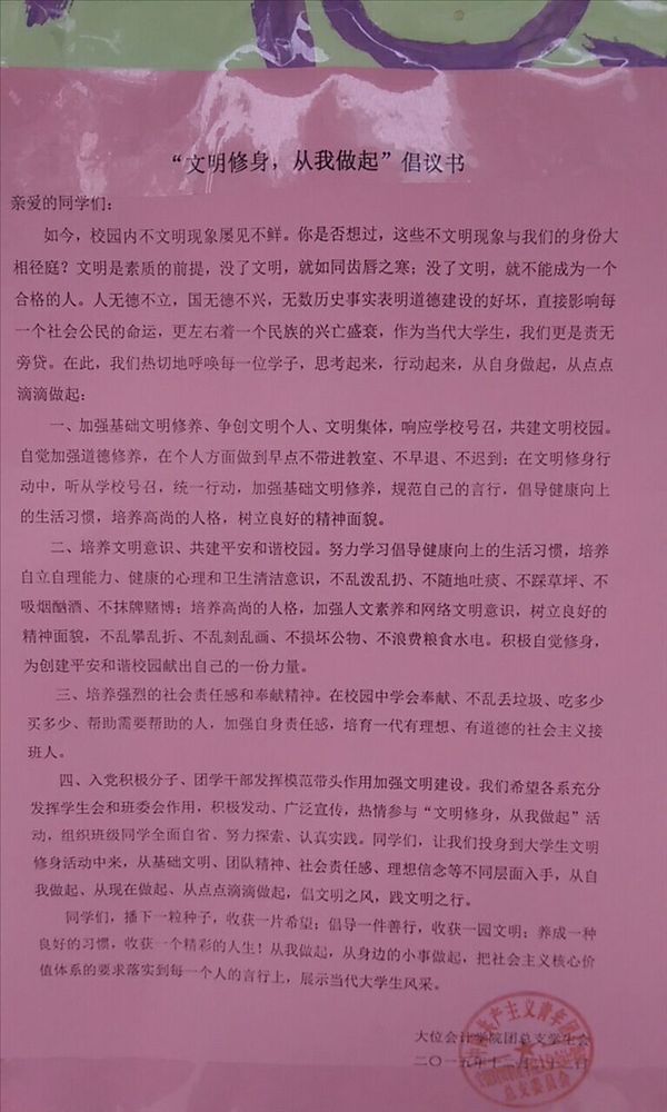 12月22日,大位会计学院以团总支学生会的名义向全院学生发起“文明修身,从我做起”的文明倡议,倡议书中表示要加强基础文明修养、培养文明意识、培养强烈的社会责任感和奉献精神、发挥团学干部的积极带头作用,把社会主义核心价值观落实到言行中。