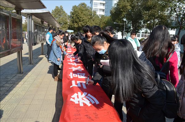 12月18日,团总支学生会在食堂东门开展了“参与高水平大学建设,从文明进教室开始”大型签名活动。广大师生纷纷在条幅上签下自己名字,表达对文明进教室行为的支持和承诺。