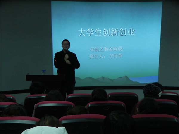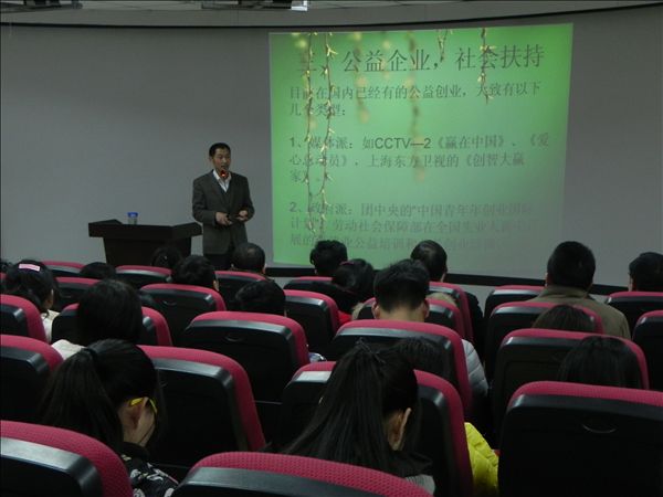 旅游管理系主任刘葆到会致欢迎词,新安晚报教育旅游事业部主编刘高威、安徽托雅教育管理公司总经理方何荣、安徽华博胜训信息科技股份有限公司总监付学挺、微金易贷总监谢同侠分别就以“公益与创业”、“大学生创新创业之准备阶段”、“大学生公益创业项目融资平台”、“O2O平台与教育创业”等为题发表了主题演讲,并且与现场的同学们进行了热烈互动交流。