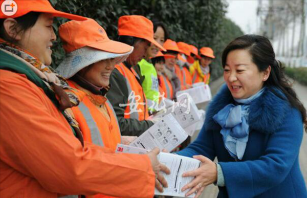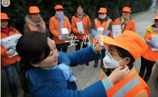 12月20日清晨,合肥雾霾弥漫。旅游管理系党总支副书记宋凌云专程赶往合肥高新区,代表该系2015届酒店管理专业毕业生将精心挑选的300只防霾口罩送给那里的环卫工人,表达一份爱心。