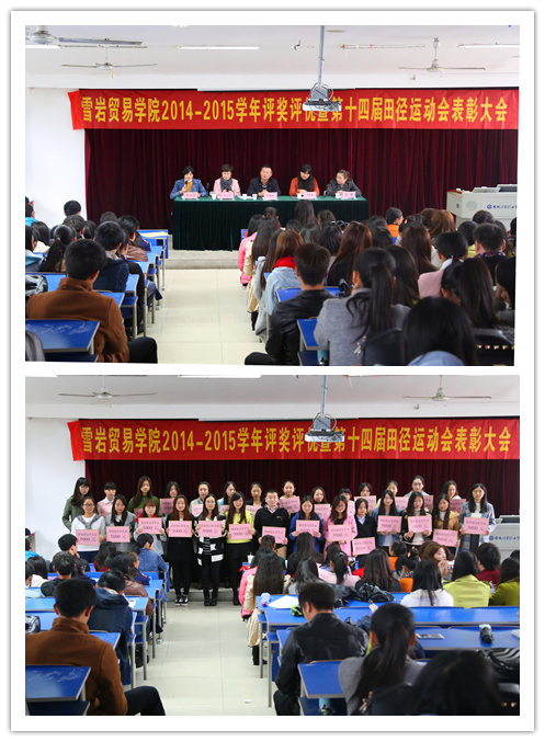 11月11日中午,雪岩贸易学院2014—2015学年度学生表彰大会在5102教室举行。雪岩贸易学院副院长郭湘如、司爱丽,党总支副书记胡宏萱出席会议。会议表彰了2014—2015学年度国家奖学金、国家励志奖学金、学院奖学金、三好学生、优秀学生干部获得者及第十届田径运动会获奖运动员和领队老师,大会由专职辅导员陈曦主持。