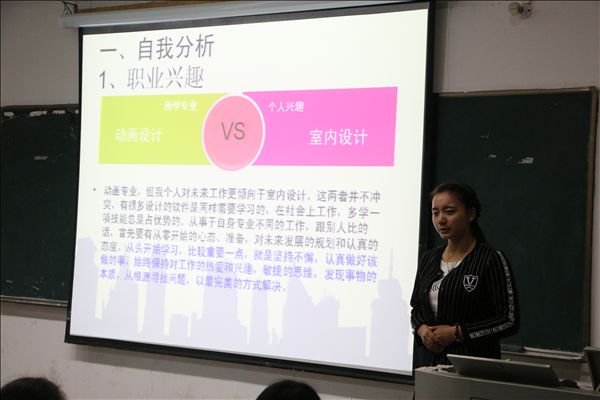 职业规划选手通过自我分析、职业分析、路径选择、实施计划等方面充分展示了自己对未来职业梦想的追求,比赛分为个人作品展示和评委现场问答两个环节。职业规划组10组选手中装饰1401班级彭保帝脱颖而出,获得一等奖,晋级学院决赛。装饰1503黄舒霞、动漫1501杨云洁荣获二等奖,装饰1503耿直、装饰1501江晗、会展1501张金雪荣获三等奖。