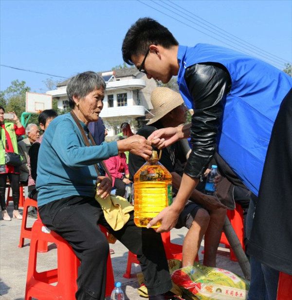 此次重阳节官岭村之行,师生和万源劝善平台的志愿者们还为村里的五保、孤寡老人们准备了大米、食用油、水果等生活物资。得知村里的五保老人生活拮据,同学们自发在校园内开展了募捐活动,近5000元的善款也如数抵达到村里需要帮助的老人手里。村里的鲁培稳老人感动地抓住一个志愿同学的衣服说:“我真舍不得你们走。”还有人问:你们下次还来吗?要不今天在村里歇一夜吧。”
