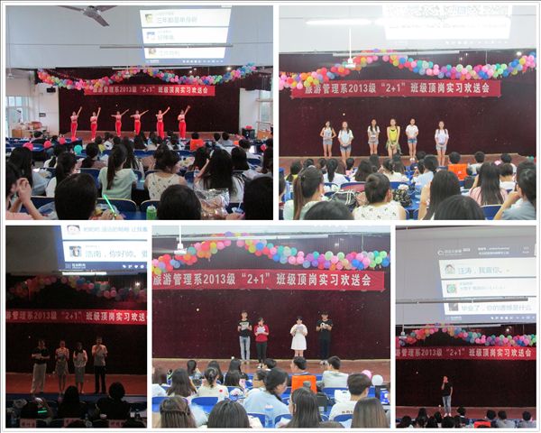 6月24日晚,5103教室全场座无虚席,“旅游管理系2013级‘2+1’班级顶岗实习晚会”温情上演。系主任刘葆、党总支副书记宋凌云、副主任钟晓鹏等出席了晚会。