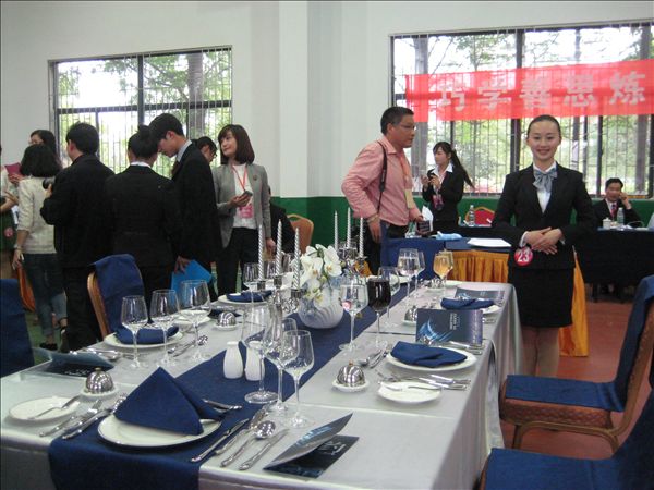 在西餐宴会服务摆台环节,程凯丽同学布置的台面以“湖滨之约”为主题,银色台面点缀蓝色装饰体现优雅的商务氛围;张亚群同学布置的“乐享感恩”则突出了感恩节的欢乐气氛。在英文台面介绍环节,两位选手用流利的英文阐释了的台面主题,并回答评委提问。鸡尾酒调制环节,选手需在5分钟内调制“五色彩虹酒”,要求调制过程中手法准确,不滴不撒;成品层次分明,高度均匀。两位选手都出色地完成了各项比赛,她们流畅的操作,专业的手法以及灿烂的微笑都给赛场观摩的观众留下了深刻的印象。