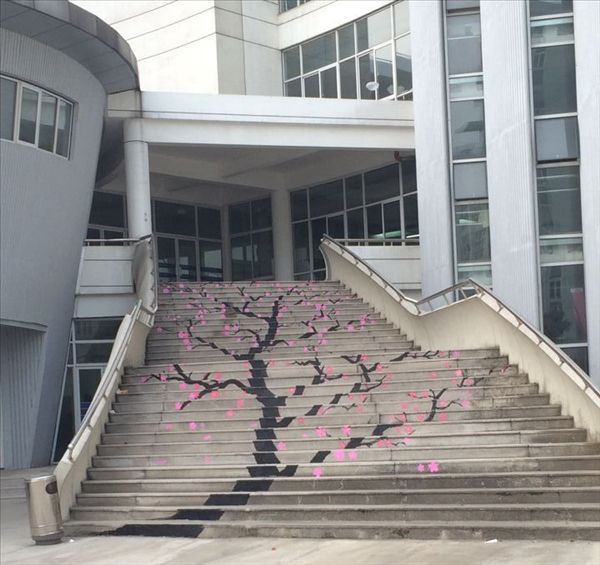 在征询相关部门的意见后,经请示学院同意,艺术设计系的同学们学习之余利用课余时间集体创作了这幅100多平米的艺术涂鸦。为了让作品直观感受效果最佳,创作前,同学们还仔仔细细地打扫清洗了露天楼梯,将全部的苔癣和污渍去处干净,然后用准备好的不脱色涂料、笔刷、喷漆和油漆等材料,在生硬的水泥楼梯上创作出一幅硕大的樱花树。