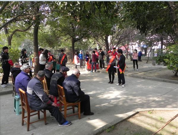 迎着金色的晨曦,身披红色学院绶带的志愿服务同学早早来到经开区敬老院。同学们为老人们分发香蕉、橘子等慰问品,为老人们表演精心排练的小品、歌舞、戏曲等节目。当黄梅戏婉转悠扬的旋律响起,同学带着泥土芳香的演唱受到了老人们的热烈欢迎。演出结束后。大家你牵着老爷爷的手,我坐在老奶奶身边,陪老人晒太阳聊天。同学们给老人讲学校里的新鲜事,听老人讲朝鲜战争的故事,场面温暖动人。当同学们跳起“小苹果”时,老人乐呵呵地鼓掌加油!欢声笑语洒满小院,笑容洋溢在老人们的脸上。