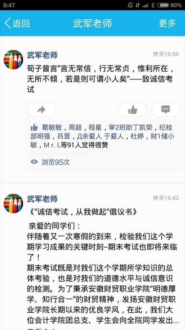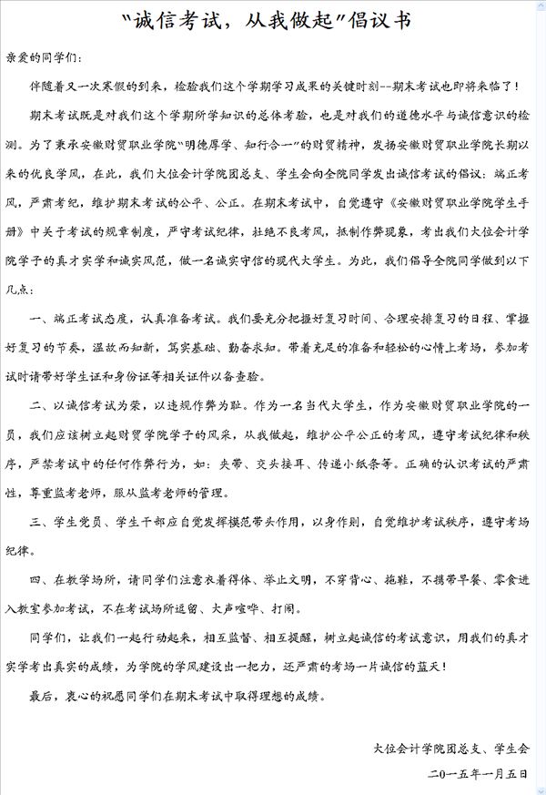 1月3日,大位会计学院官方微博发布了《诚信考试,从我做起》的倡导书,学生秘书武军老师也在自己的腾讯空间、微信上发表了对诚信考试的观点,不少同学网上点赞表示同意。