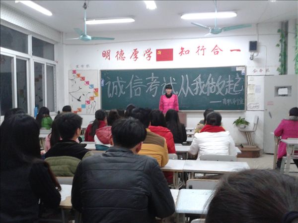 1月5日晚,2014级新生班级以“诚信考试,从我做起”为主题开展了口语训练,从做人、求知、德行等多方面发表了关于诚信的观点和事例。不少同学还郑重宣誓,表明自己秉承诚信行为的决心。