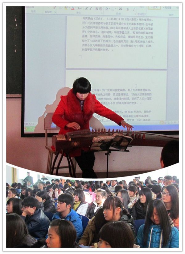 通过陈素勤老师的介绍,同学们了解了古筝的起源、历史发展以及古筝的基础知识,并观赏了陈老师演示的古筝弹奏中“勾、拖、抹”等基本手法及点弦和揉弦等技法以及古筝名曲《渔舟唱晚》和《高山流水》等曲目。