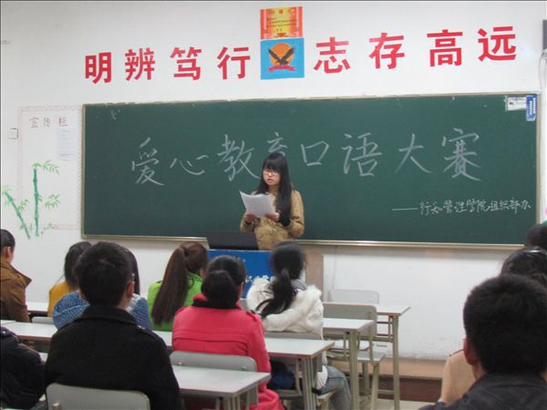 11月19日晚,行知管理学院2014级新生班级均以“爱心”为主题进行了口头训练,该院组织部深入现场观摩并打分,遴选出房产1402石大乔、连锁1401黄泊婉、工商1402杨青梅三位同学代表参加学院的最终决赛。