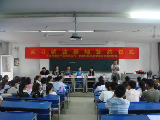 6月23日,行知管理学院与合富辉煌房产安徽省总公司在5101教室举行了实训实习就业基地签约暨揭牌仪式。出席签约仪式的有该公司人力资源部总监孔晶晶、人力资源部主管温华夏,行知管理学院副书记唐学华、副院长方春龙、副书记刘大俊,房地产教研室专业教师朱清主持仪式。