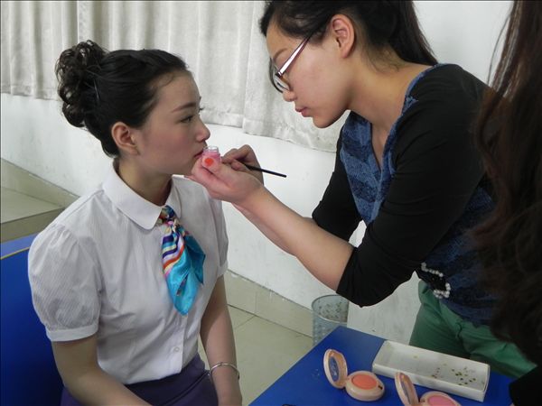 5月1日上午8时,一个个朝气蓬勃、神采飞扬的女孩,手提色彩斑斓的化妆包从四面八方赶向化妆间,为学院建校50周年暨学院第十一届校园文化艺术节文艺晚会的演职人员做上台前的化妆准备。彩妆班志愿报名的41人组成的的化妆团队要为近400人次的演员及礼仪队化妆,任务庞大而繁重。但化妆队员无怨言、不气馁,坚持不懈、迎难而上,以自己最好的状态投入到任务中,展现了化妆队认真负责的工作态度。指导老师宋凌云一大早将化妆用品分发到各个小组,并亲自到教室为各节目定妆,在她的带领下,所有化妆队员们流水作业:有人打底、有人画腮红、还有人画眼影。化妆刷在姑娘们的手中幻化为舞动的精灵,舞蹈演员们精致的面容顷刻即成,为晚会的精彩纷呈奠定了坚实的基础。化妆队员辛勤的劳动成果也得到了院领导的一致肯定,好评如潮。