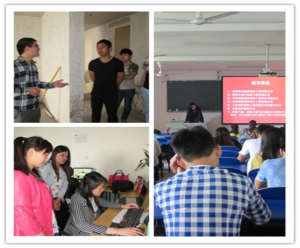 在深圳极尚建筑装饰工程有限公司、深圳市设计装饰工程有限公司、合肥纳雅建筑装饰工程设计有限公司、合肥雅特装饰设计工程有限公司、上海领轩装饰工程有限公司安徽分公司、合肥郎星设计公司等六家装饰公司中,同学们实际参与量房、绘图、项目前期的方案设计、方案后期的效果图展示等;部分同学还实地参观了施工现场,企业的知名设计师在现场为同学们讲解了施工工艺。