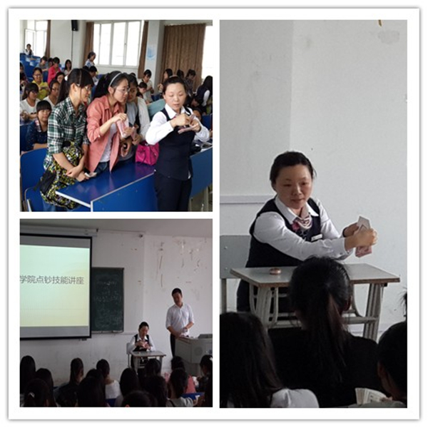 近日,大位会计学院邀请合肥市徽商银行天鹅湖支行郭宏川经理和点钞能手闫红,在5202教室举行了点钞技能知识讲座,帮助学生了解、熟悉点钞的技巧和方法,积极备战2014年职业技能节。