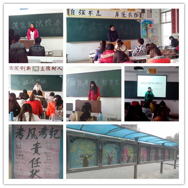 各班级于12月中旬先后召开了以“积极备考,诚信应考”为主题的诚信考试主题班会,结合本班级特点建立了诚信考试班级承诺书制度,通过签订责任状、签名承诺、特色板报等多种形式加强教育宣传,倡导大家刻苦学习,公平竞争,诚信考试,诚实做人,使学生深深认识到学习在于勤奋刻苦,作弊不仅是对自己能力的否定和蔑视,更是对良好学风校风的亵渎。