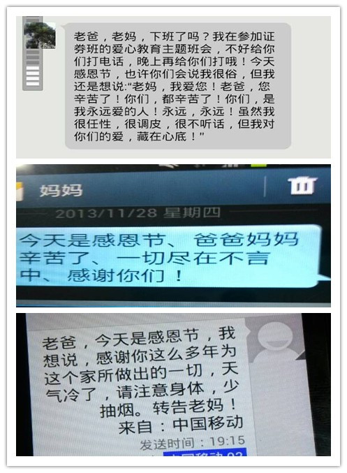 财税金融系倡议每位2013级学生感恩节当天给父母打个电话或发条短信,倡议一经发出,得到了同学们的积极响应。同学们通过打电话或发短信的方式,向父母吐露了自己平时羞于表达却又一直深藏于内心的情感,以此感激父母多年的养育之恩,表达对父母最真挚的爱和祝福。