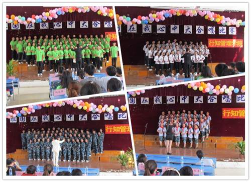 10月9日下午,行知管理学院在5103教室成功举办了以“祖国在我心中”为主题的2013级新生大合唱比赛,党总支副书记唐学华、刘大俊以及徐莲、曹宝亚等多位老师担任评委,行知管理学院全体师生欣赏了这场红色盛典。
