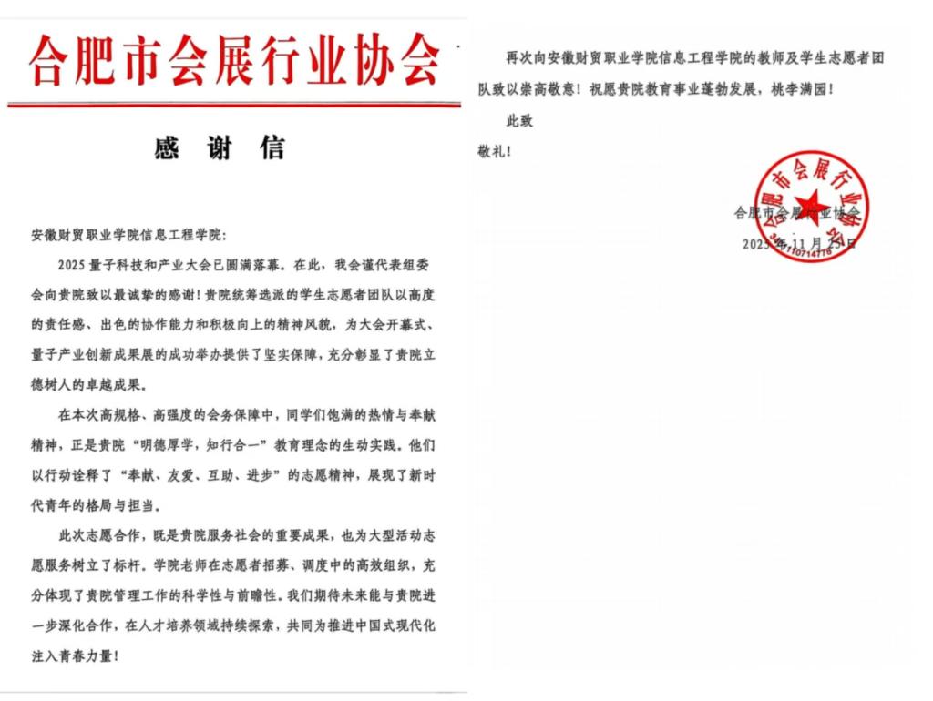 活动后,大会主办方向学校发来感谢信,称赞“安徽财贸职业学院志愿者团队,以党建引领聚合力,以专业服务显担当,为大会顺利举办作出重要贡献”。此次活动,学子们不仅为量子科技和产业大会提供了优质服务,更让他们在这场科技盛会中感受到国家战略的深远布局与磅礴力量,进一步推动了他们在未来的学习与实践中,主动将个人成长与国家发展同频共振,以青春担当书写新时代青年的责任与荣光。(供稿:丁蓉 审稿:邓庆安)