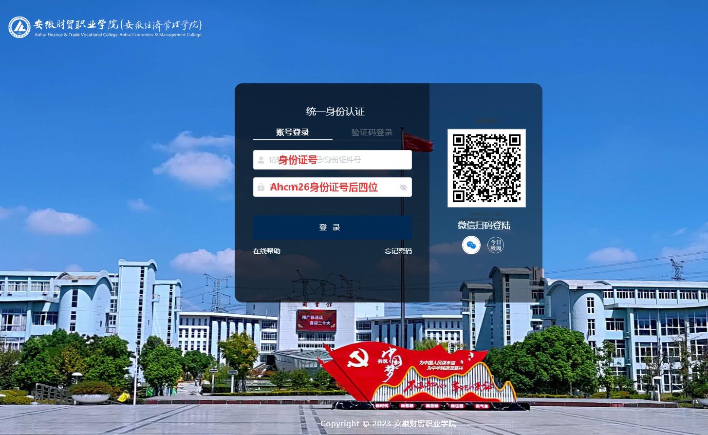【登录方式】 用户名:学号(录取查询窗口获取),初始登录密码:Afc!@+证件号后六位。
